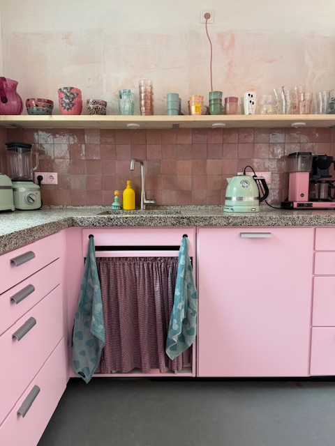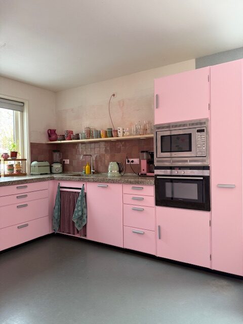 Roze! De keukenfronten zijn felroze en de kast heeft een iets lichtere tint. Die was eerst spierwit, maar ik houd helemaal niet van wit. Ik ben zelf kleurrijk en ons huis ook, dus roze past veel beter bij ons. Met die strakke, gladde lak is het één geheel geworden dat bij ons en ons interieur past.